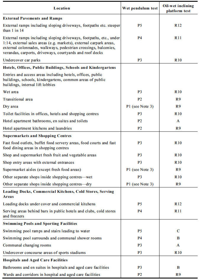 - Wet Pendulum Test (P Rating). This covers pedestrian areas that are exposed to rain water.